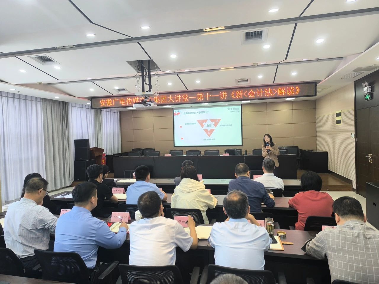 為積極適應會計政策新變化,加強財會監(jiān)督、嚴肅財經(jīng)紀律,進一步提升集團經(jīng)營單元的依法合規(guī)經(jīng)營意識,4月24日下午,安徽廣電集團大講堂舉行第十一講,集團外部董事王青作《新〈會計法〉解讀》專題輔導。集團黨委委員、董事、常務副總經(jīng)理苗峰主持培訓。