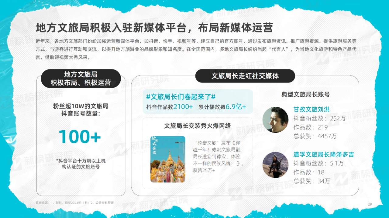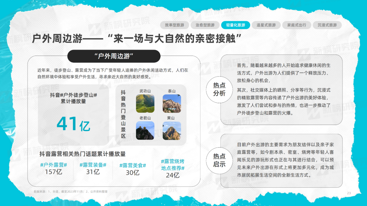 由此,新榜推出《2023年度文旅內(nèi)容洞察報告》,旨在通過對抖音、快手、小紅書、B站、視頻號等平臺的文旅內(nèi)容以及熱門旅行方式的多維度觀察,展現(xiàn)2023年文旅行業(yè)內(nèi)容的發(fā)展現(xiàn)狀,為相關(guān)從業(yè)者提供相應(yīng)的策略建議。