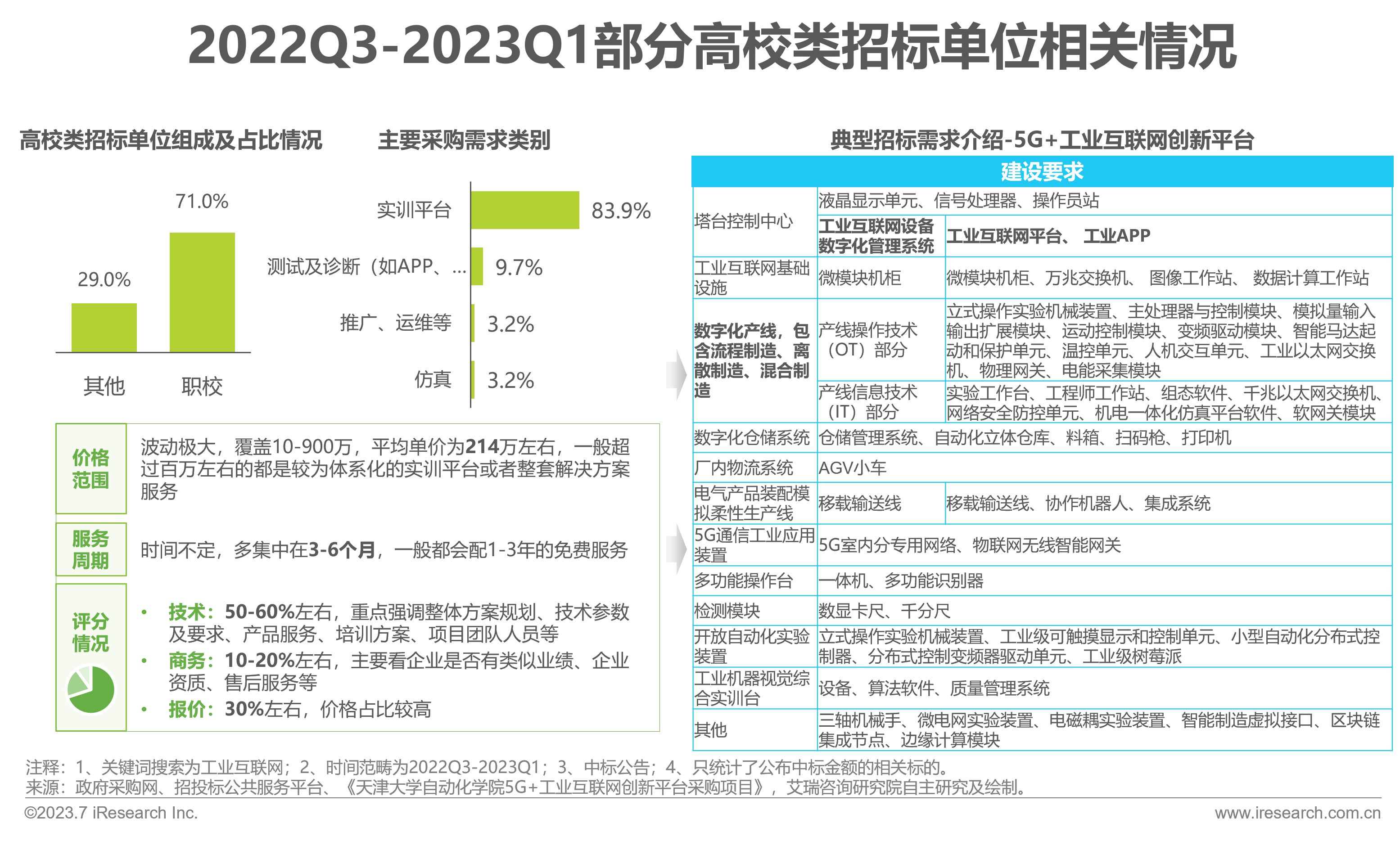 高校對工業(yè)互聯(lián)網(wǎng)的需求主要是建設(shè)實訓(xùn)平臺所推動的,占比為83.9%。與政府側(cè)和企業(yè)側(cè)相比,高校側(cè)主要有兩點差異:1)更多的是資金驅(qū)動,學(xué)校不同,實訓(xùn)平臺建設(shè)內(nèi)容不同,大部分的高校還是以單一模塊的實訓(xùn)建設(shè)為主,只有很少一部分會關(guān)注整個產(chǎn)線的實訓(xùn);2)在招標(biāo)評分中,技術(shù)分占比為50-60%,而報價分占30%左右。