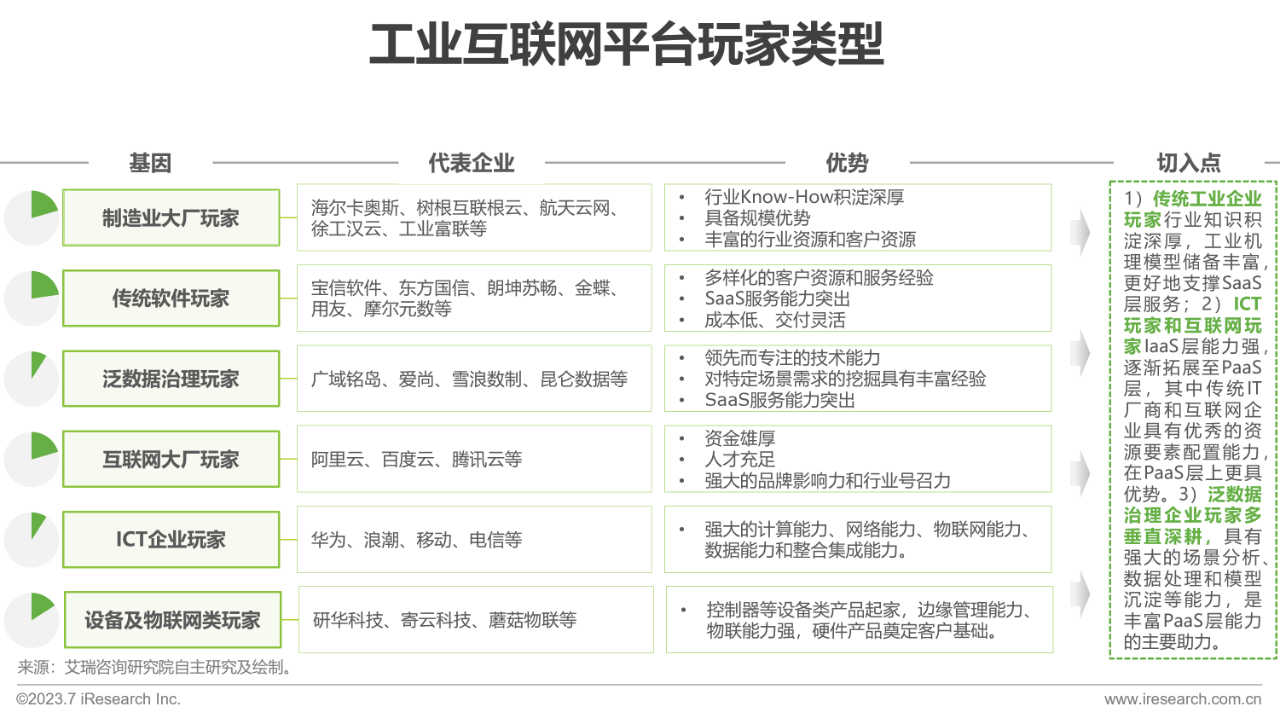 由于中國工業(yè)互聯(lián)網(wǎng)平臺市場目前仍處于初步發(fā)展期,供給方仍然以規(guī)模性的大企業(yè)為主,這些企業(yè)技術(shù)底蘊較深、服務(wù)經(jīng)驗豐富、資金雄厚且具有一定行業(yè)影響力。占據(jù)主要市場份額的玩家中,可以根據(jù)企業(yè)基因類型分為制造業(yè)大廠玩家、傳統(tǒng)軟件玩家、互聯(lián)網(wǎng)大廠玩家、ICT企業(yè)玩家(包含傳統(tǒng)IT廠商和電信運營商)、泛數(shù)據(jù)治理玩家和設(shè)備及物聯(lián)網(wǎng)類玩家六類。不同基因給玩家?guī)淼膬?yōu)勢和路徑各不相同,如制造業(yè)大廠,一方面,行業(yè)know-how理解深,行業(yè)經(jīng)驗相對容易沉淀為機理模型;另一方面,企業(yè)本身就是需求方,產(chǎn)品及服務(wù)可能更容易滿足需求方的需求屬性;ICT和互聯(lián)網(wǎng)企業(yè)玩家基礎(chǔ)設(shè)施底座能力強;泛數(shù)據(jù)治理企業(yè)垂直深耕能力強,是PaaS層的主要構(gòu)成者。