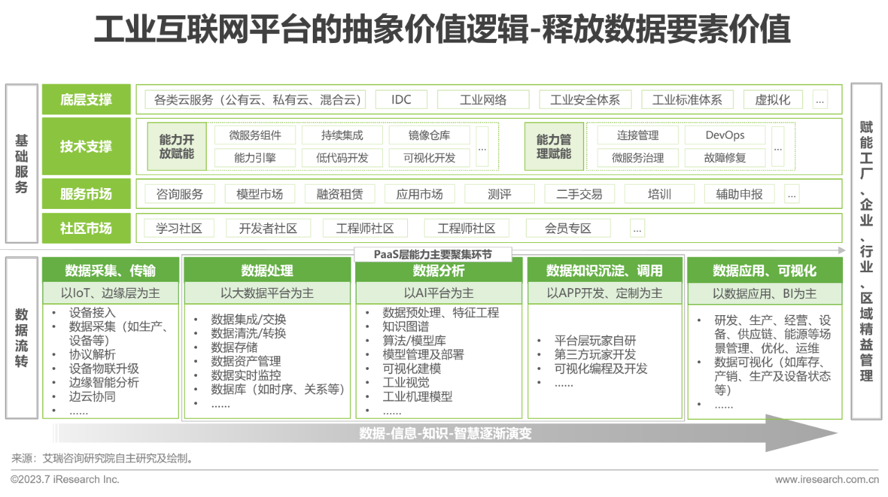 工業(yè)互聯(lián)網(wǎng)平臺的核心是釋放企業(yè)經(jīng)營活動形成的數(shù)據(jù)資產(chǎn)的價值,其中“數(shù)據(jù)從哪里來、數(shù)據(jù)怎么用、數(shù)據(jù)價值如何構(gòu)建”等是平臺企業(yè)需要考慮并解決的主要問題。當(dāng)前市場上工業(yè)互聯(lián)網(wǎng)平臺企業(yè)主要具備兩大類能力:其一,基礎(chǔ)服務(wù)能力(如底層支撐、技術(shù)支撐),其通用屬性更強;其二,圍繞數(shù)據(jù)生命周期提供服務(wù),覆蓋數(shù)據(jù)采集及傳輸-數(shù)據(jù)處理-數(shù)據(jù)分析-數(shù)據(jù)知識沉淀及調(diào)用-數(shù)據(jù)可視化應(yīng)用等全周期,涵蓋物聯(lián)網(wǎng)、大數(shù)據(jù)、AI等各類技術(shù),其中數(shù)據(jù)分析、數(shù)據(jù)知識沉淀的專用屬性更強,也是行業(yè)壁壘、企業(yè)服務(wù)壁壘的重要體現(xiàn)。從輸出的服務(wù)體系來看,工業(yè)互聯(lián)網(wǎng)平臺服務(wù)商已初步形成PaaS平臺底座+生態(tài)共筑、應(yīng)用APP、綜合解決方案等服務(wù)。