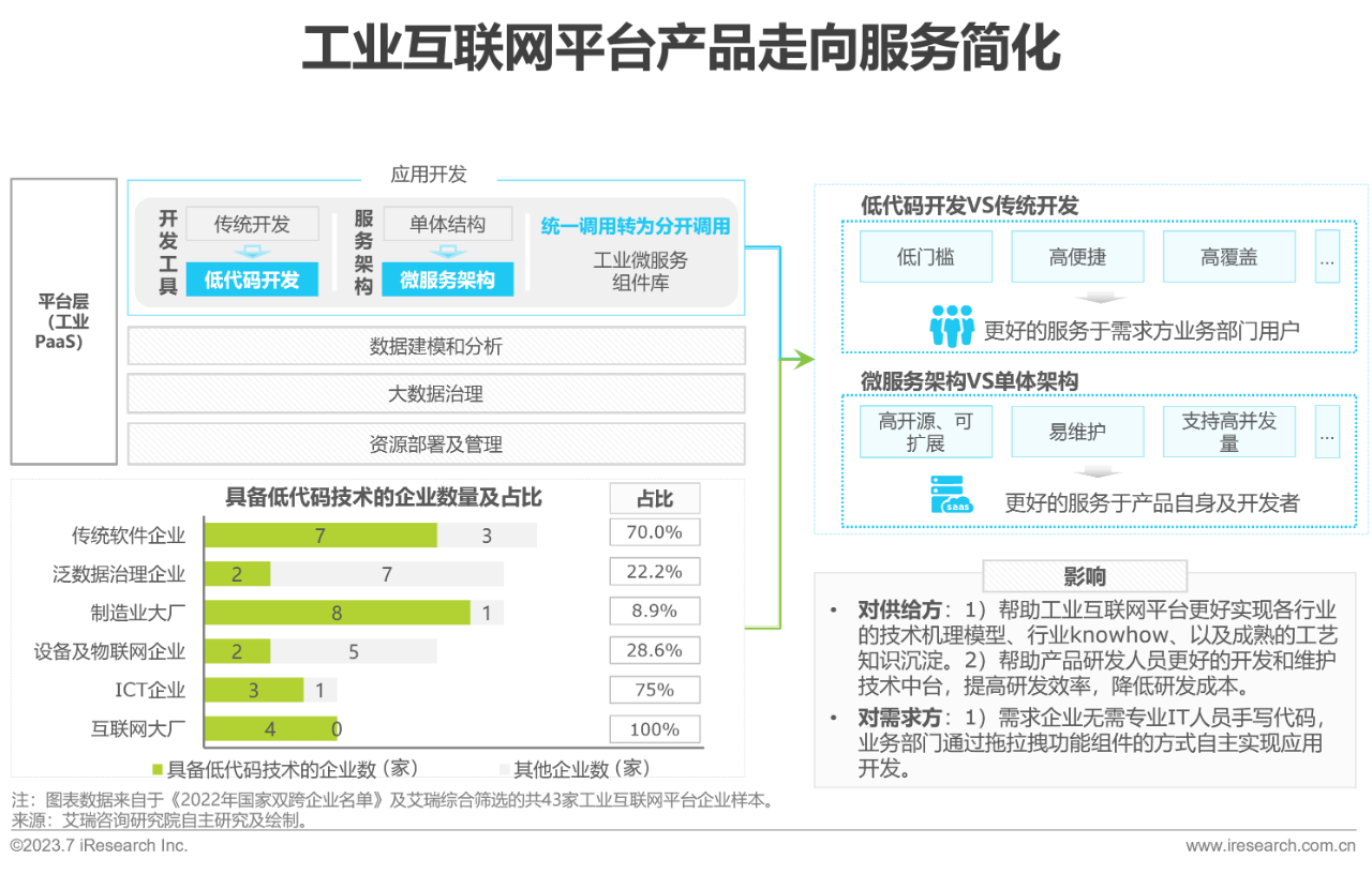 平臺由單體架構(gòu)走向微服務(wù)架構(gòu)、傳統(tǒng)代碼開發(fā)走向低代碼開發(fā),應(yīng)用開發(fā)模式逐漸走向低門檻、高開源、高便捷,平臺產(chǎn)品的服務(wù)形式相對簡化,主要好處有兩點:1)加強產(chǎn)品架構(gòu)的可擴展性和易維護(hù)性;2)擴大開發(fā)者覆蓋范圍。以上兩點,對供需企業(yè)雙方都有裨益:對供給方,實現(xiàn)工業(yè)機理高效地沉淀和調(diào)用的同時,還有利于研發(fā)人員更好地優(yōu)化開發(fā)和維護(hù);對需求方,能幫助懂生產(chǎn)制造等核心環(huán)節(jié)但無編程經(jīng)驗的業(yè)務(wù)人員實現(xiàn)自主開發(fā),實現(xiàn)需求方的高效應(yīng)用及管理。