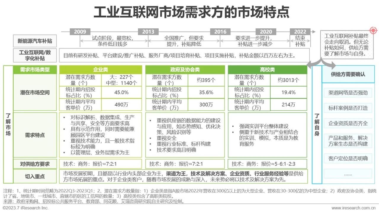 與新能源行業(yè)類似,工業(yè)互聯(lián)網(wǎng)/數(shù)字化的補貼也將經(jīng)歷從寬松到收緊、從高補貼到低補貼,甚至是取消補貼的過程。就工業(yè)互聯(lián)網(wǎng)市場長期發(fā)展而言,無論補貼持續(xù)時間多久,未來是否存在,供給方最終都需要滿足用戶的需求。因此供給方企業(yè)都需要結(jié)合渠道關(guān)系、技術(shù)及解決方案、企業(yè)資質(zhì)、行業(yè)服務(wù)經(jīng)驗等市場拓展重點,明晰自身優(yōu)勢,確認(rèn)產(chǎn)品及服務(wù)特點,錨定適合自身的賽道和客戶,方能適應(yīng)市場變化。