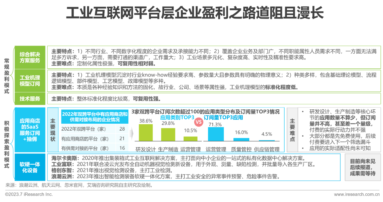 當(dāng)前工業(yè)互聯(lián)網(wǎng)市場大多是“賠錢賺吆喝”,新的變現(xiàn)模式正在不斷探索。但就目前而言,盈利變現(xiàn)依然道阻且艱。除去常規(guī)的綜合解決方案等盈利模式外,目前平臺分發(fā)抽傭+軟硬一體化設(shè)備兩大類模式為企業(yè)所積極探索。針對分發(fā)抽傭,目前呈現(xiàn)對平臺的生態(tài)貢獻(xiàn)可能遠(yuǎn)高于盈利貢獻(xiàn)的特點,其主要原因是研發(fā)設(shè)計、生產(chǎn)制造等核心環(huán)節(jié)本身的復(fù)雜性太高、企業(yè)差異性太強,應(yīng)用的適配性不高。據(jù)不完全統(tǒng)計,在訂閱次數(shù)超過100的應(yīng)用中,研發(fā)設(shè)計、生產(chǎn)制造的應(yīng)用數(shù)量占據(jù)TOP2,占比達(dá)68.4%,但就訂閱總數(shù)而言,運營管理呈絕對優(yōu)勢,占比達(dá)71.3%,這也說明用戶更趨向于為解決實際需求付費。針對軟硬一體化,目前依然處于探索期,早前有報道,但現(xiàn)階段尚未看到后續(xù)報道,究竟是折戟沉沙,還是即將大獲全勝,我們拭目以待。