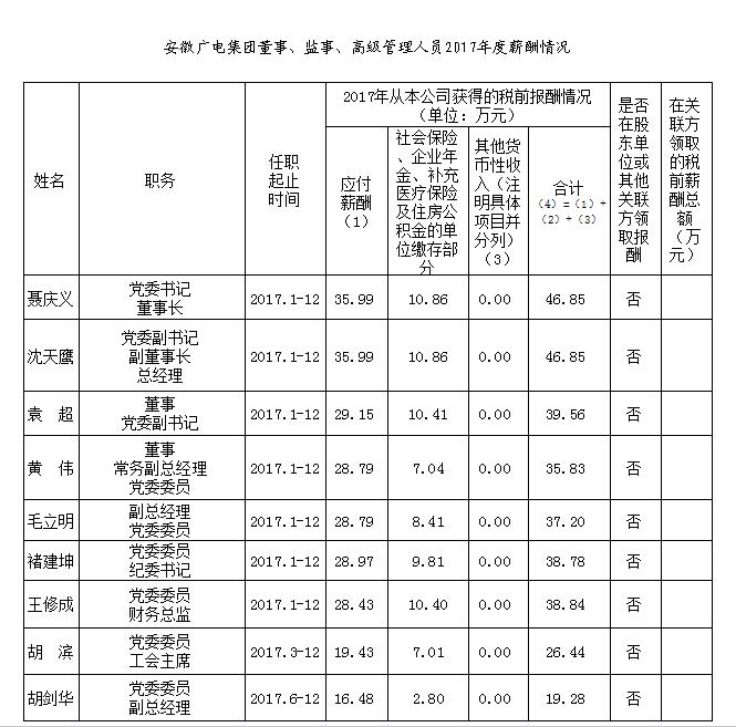 安徽廣電傳媒產(chǎn)業(yè)集團(tuán)有限責(zé)任公司負(fù)責(zé)人2017年度薪酬情況