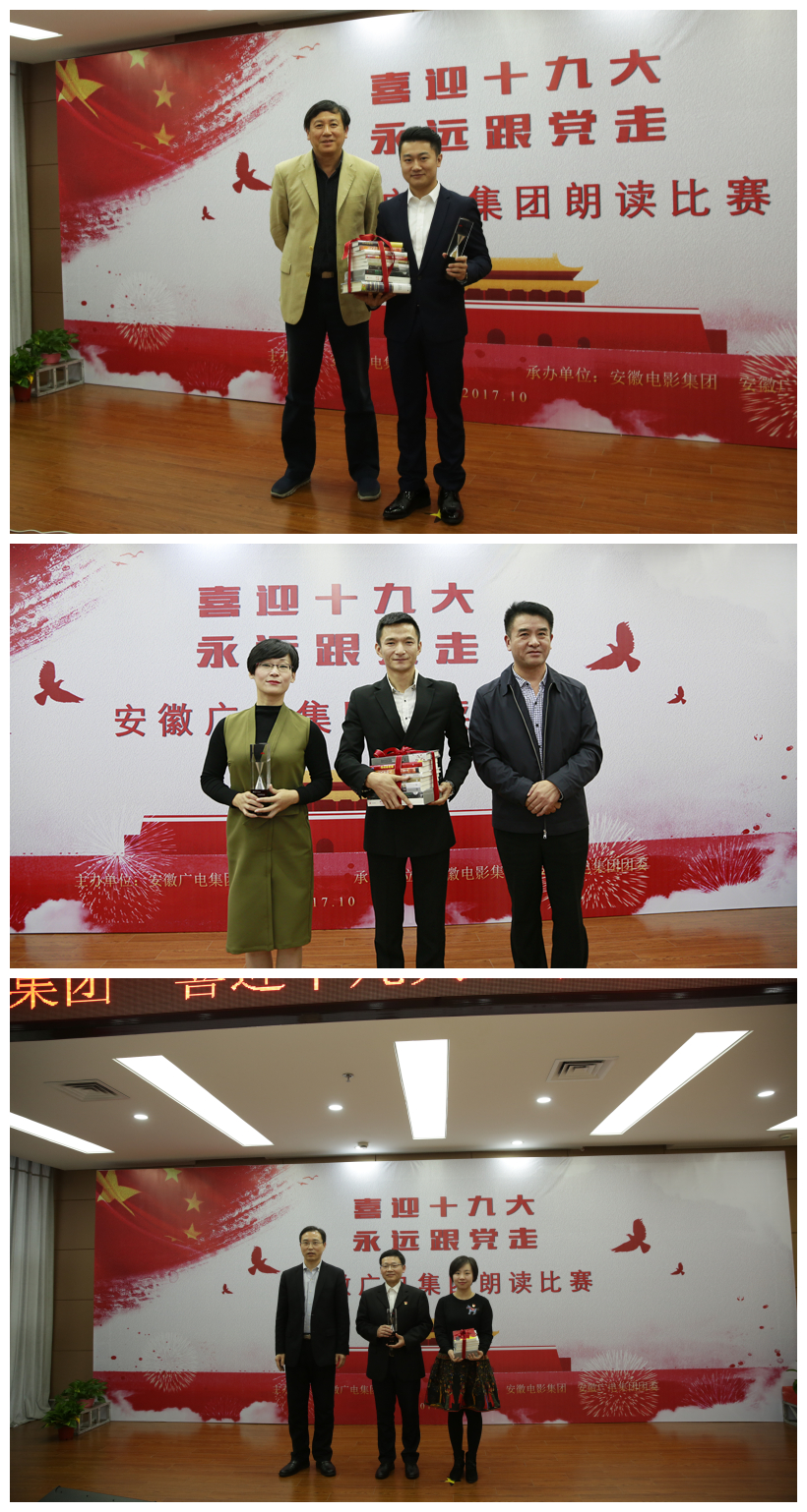 在黨的十九大勝利召開(kāi)之際,10月20日下午,由集團(tuán)工會(huì)主辦,安徽電影集團(tuán)和集團(tuán)團(tuán)委承辦的“喜迎十九大、永遠(yuǎn)跟黨走”朗讀比賽在集團(tuán)十樓第一會(huì)議室舉行。集團(tuán)常務(wù)副總經(jīng)理黃偉、紀(jì)委書記褚建坤、工會(huì)主席胡濱參加此次活動(dòng)。比賽邀請(qǐng)安徽交通廣播主持人張瑤和省朗誦家協(xié)會(huì)理事、安徽大學(xué)藝術(shù)學(xué)院戲劇系講師任飛擔(dān)任專業(yè)評(píng)委。集團(tuán)總部和各公司共16組選手參加比賽。