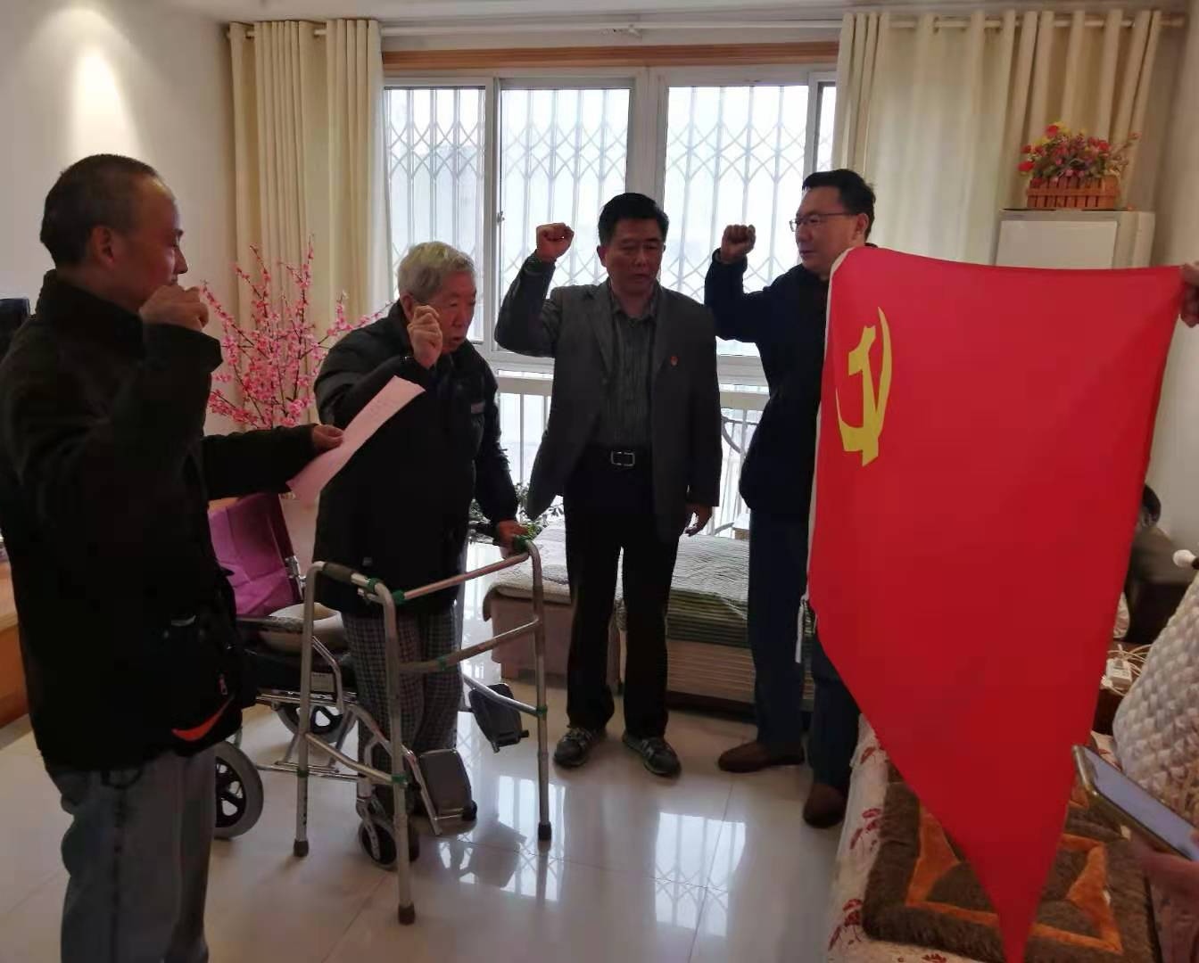 “我志愿加入中國共產(chǎn)黨,擁護黨的綱領(lǐng),遵守黨的章程,履行黨員義務(wù),執(zhí)行黨的決定,嚴(yán)守黨的紀(jì)律,保守黨的秘密,對黨忠誠,積極工作,為共產(chǎn)主義奮斗終身,隨時準(zhǔn)備為黨和人民犧牲一切,永不叛黨?!?2歲高齡的離休干部王健清同志在安徽電影集團第三黨支部書記帶領(lǐng)下,認(rèn)真宣讀入黨誓詞。