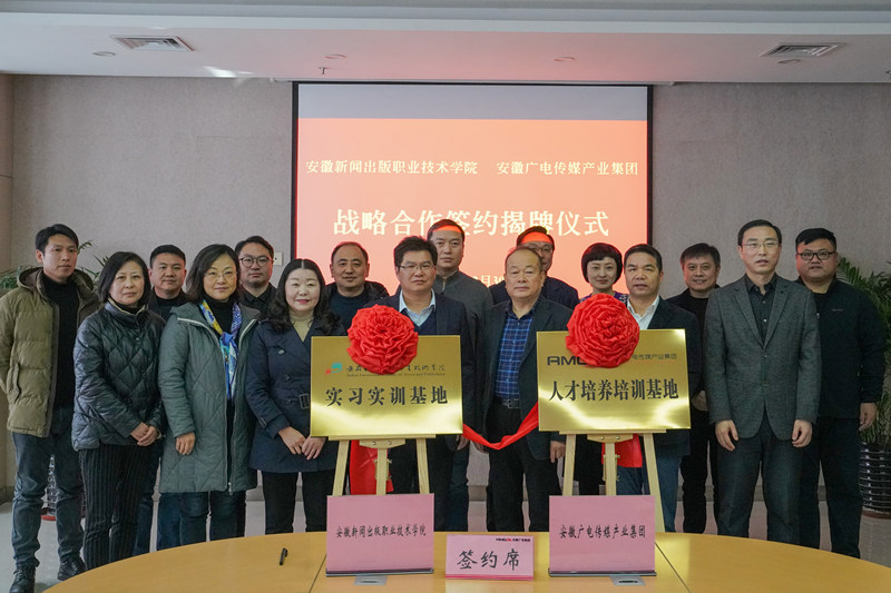 2021年12月30日上午,安徽廣電集團(tuán)與安徽新聞出版職業(yè)技術(shù)學(xué)院簽訂校企合作協(xié)議,并為“人才培養(yǎng)培訓(xùn)基地”和“實習(xí)實訓(xùn)基地”揭牌。集團(tuán)黨委書記、董事長李樹,安徽新聞出版職業(yè)技術(shù)學(xué)院黨委書記武瀟分別致辭并揭牌。集團(tuán)黨委委員、董事、常務(wù)副總經(jīng)理苗峰與安徽新聞出版職業(yè)技術(shù)學(xué)院黨委副書記、院長岳毅平簽訂校企合作協(xié)議,安徽電影集團(tuán)黨總支書記、董事長虞詠與安徽新聞出版職業(yè)技術(shù)學(xué)院黨委委員、宣傳部長、學(xué)生處處長周玉松簽訂校企合作協(xié)議。集團(tuán)黨委委員、副總經(jīng)理胡濱等出席簽約儀式。
