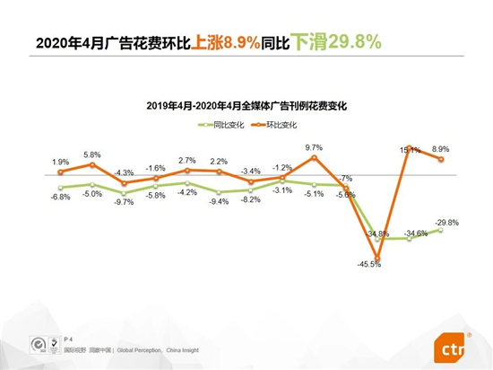 新冠疫情還未結(jié)束,但隨著全面復(fù)工復(fù)產(chǎn)的有序進(jìn)行,其對(duì)廣告市場(chǎng)的影響在逐漸減少。根據(jù)CTR媒介智訊的數(shù)據(jù)顯示,2020年4月廣告市場(chǎng)整體刊例花費(fèi)環(huán)比繼續(xù)提升,達(dá)到8.9%,同比降幅也有所收窄,為-29.8%。