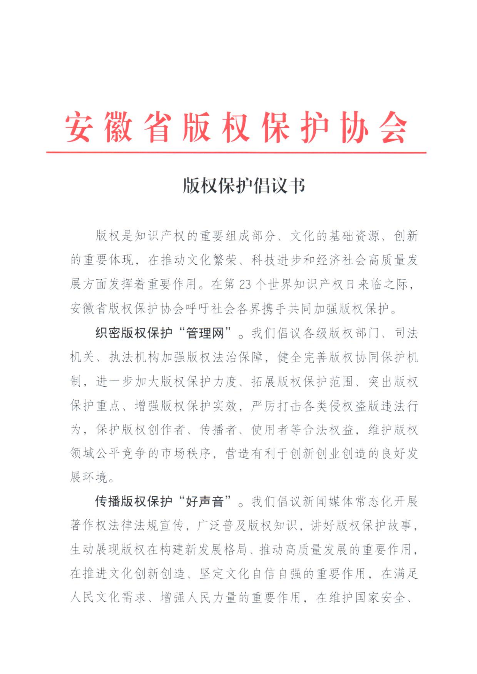 版權(quán)是知識產(chǎn)權(quán)的重要組成部分、文化的基礎(chǔ)資源、創(chuàng)新的重要體現(xiàn),在推動文化繁榮、科技進(jìn)步和經(jīng)濟(jì)社會高質(zhì)量發(fā)展方面發(fā)揮著重要作用。在第23個世界知識產(chǎn)權(quán)日來臨之際,安徽省版權(quán)保護(hù)協(xié)會呼吁社會各界攜手共同加強版權(quán)保護(hù)。